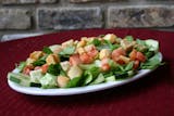 A bed of lettuce topped with cucumber, tomato & croutons, served with Caesar dressing and Romano cheese.