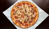 Italian sausage, pepperoni, bacon, ground beef, mushroom, onion, bell pepper, green & black olives and grated cheese. (On double dough).